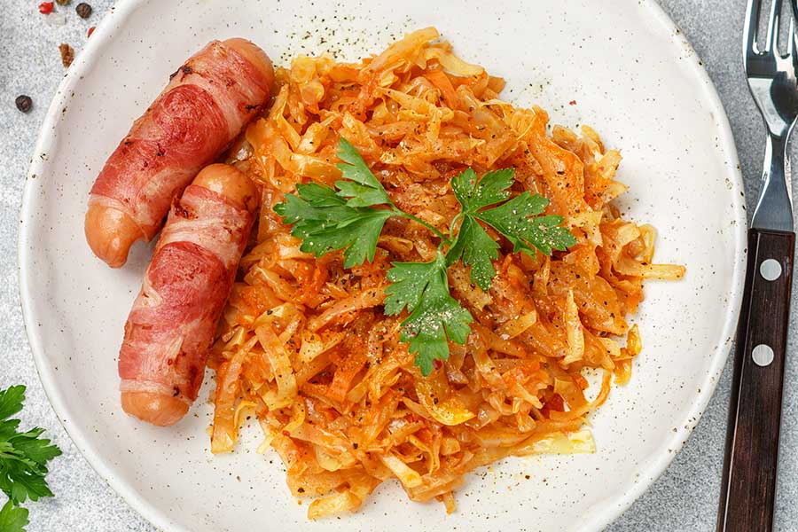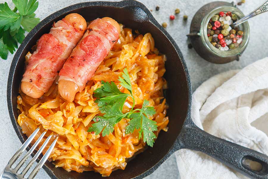 Servi il cavolo stufato ben caldo, aggiungi sopra i wurstel avvolti e completa con una generosa grattugiata di pepe.